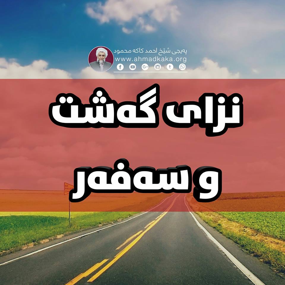 نزای_گەشت_و_سەفەر دەڵێیت : (اللهُ أَكْبَرُ, اللهُ أَكْبَرُ, اللهُ أَكْبَرُ , سُبْحانَ الَّذِي سَخَّرَ لَنَا هَذَا وَمَا كُنَّا لَهُ مُقْرِنِينَ وَإِنَّا إِلَى رَبِّنَا لَمُنقَلِبُونَ ، اللَّهُمَّ إِنَّا نَسْأَلُكَ فِي سَفَرِنَا هَذَا الْبِرَّ وَالتَّقْوَى, وَمِنَ الْعَمَلِ مَا تَرْضَى, اللَّهُمَّ هَوِّنْ عَلَيْنَا سَفَرَنَا هَذَا وَاطْوِ عَنَّا بُعْدَهُ, اللَّهُمَّ أَنْتَ الصَّاحِبُ فِي السَّفَرِ, وَالْخَلِيفَةُ فِي الأَهْلِ, اللَّهُمَّ إِنِّي أَعُوذُ بِكَ مِنْ وَعْثَاءِ السَّفَرِ, وَكَآبَةِ الْمَنْظَرِ, وَسُوءِ الْمُنْقَلَبِ فِي الْمَالِ وَالأَهْل ) ① ِ، ئەگەر گەڕانەوە لەگەشتەکە هەرئەم نزایە دەخوێنرێت بەلام ئەمەی بۆ زیاد دەکەرێت (آيِبُونَ, تَائِبُونَ, عَابِدُونَ, لِرَبِّنَا حَامِدُون)َ . ① واتە: (خودا گەورە ترینە، خودا گەورە ترینە، خودا گەورە ترینە، پاک و بێگەردی بۆ ئەو خودایەی، کە ئەمەی بۆ ڕامکردوین (موسەخەر کردووین)و ئێمەش دەسڵاتمان نەبوو بە سەریدا، بە ڕاستی لە دوا ڕۆژیشدا ھەر بۆ لای ئەو خودایە دەگەڕێینەوە، خودایە ئێمە لەم گەشتەماندا داوای چاکە و خۆ پارێزی و ئەو کردەوانەت لێدەکەین، کە تۆ پێی ڕازیت، خودایە ئەم گەشتەمان بۆ ئاسان بکە و دووریەکەیمان بۆ نزیک بکەرەوە، خودایە تۆ پاریزەرمانبە لەم گەشتەماندا و خانەوادەکەشمان بپارێزە، کە جێمان ھێشتوون، خودایە من پەنات پێدەگرم لە ناڕەحەتی گەشتء شتێک، کە ناڕەحەتمان بکات و خراپ گەڕانەوە بۆ ماڵء خێزان، واتای زیادەی گەڕانەوەکە (گەڕاینەوە بە پەشیمانی لە تاوان و ھەروەھا بە پەرستش بۆ خودا و سوپاس و ستایش کاریشین بۆ پەروەردگارمان)) . - - - - - - - - - - - - - - - - ① : _ اسناده صحيح _ (📗صحيح البخاري - 6385) (📗صحيح مسلم - 1342) (📗 سنن ابی داود - 2599) (📗سنن الترمذي - 3447) (📗سنن الدارمي - 2715) (📗مسند احمد - 6311) (📗صحيح ابن حبان - 2696) (📗 مسند علی - 97)
