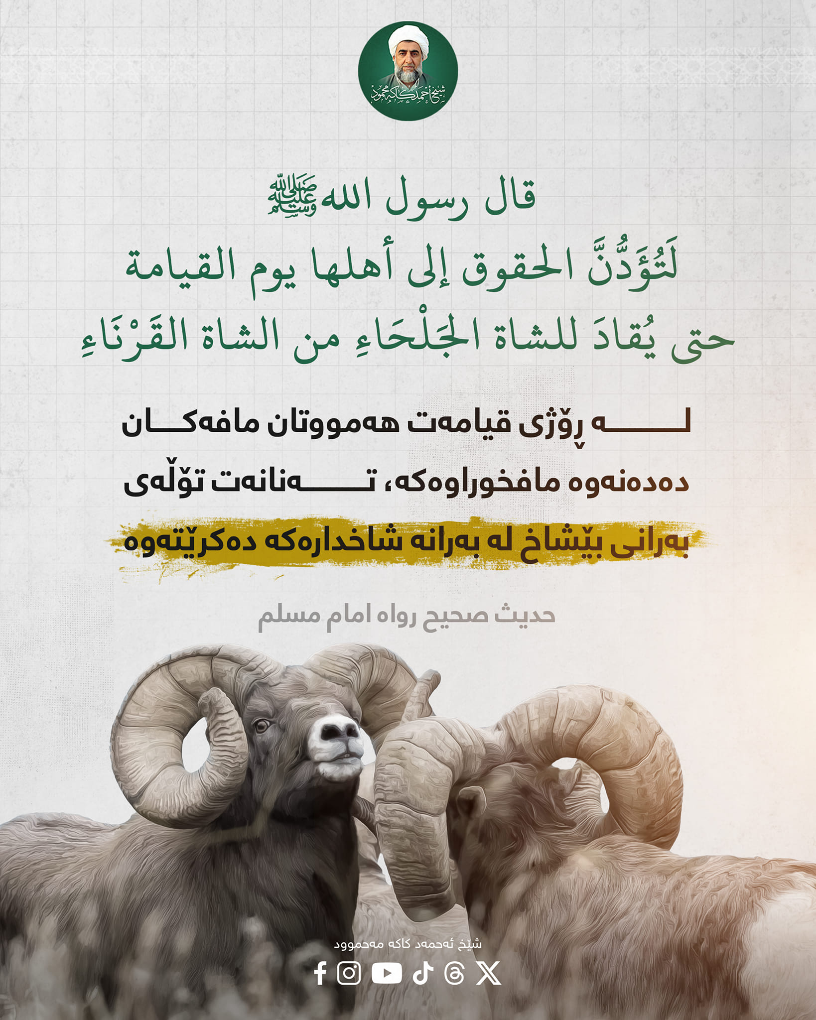 قال رسول الله ﷺ: لَتُؤَدُّنَّ الحقوق إلى أهلها يوم القيامة، حتى يُقادَ للشاة الجَلْحَاءِ من الشاة القَرْنَاءِ. واتە: لە ڕۆژی قیامەت هەمووتان مافەکان دەدەنەوە بە مافخوراوەکە، تەنانەت تۆڵەی بەرانی بێشاخ لە بەرانە شاخدارەکە دەکرێتەوە. « رواە مسلم». پڕۆژە بانگەوازییەکانی شێخ احمد کاکە محمود رحمه الله.