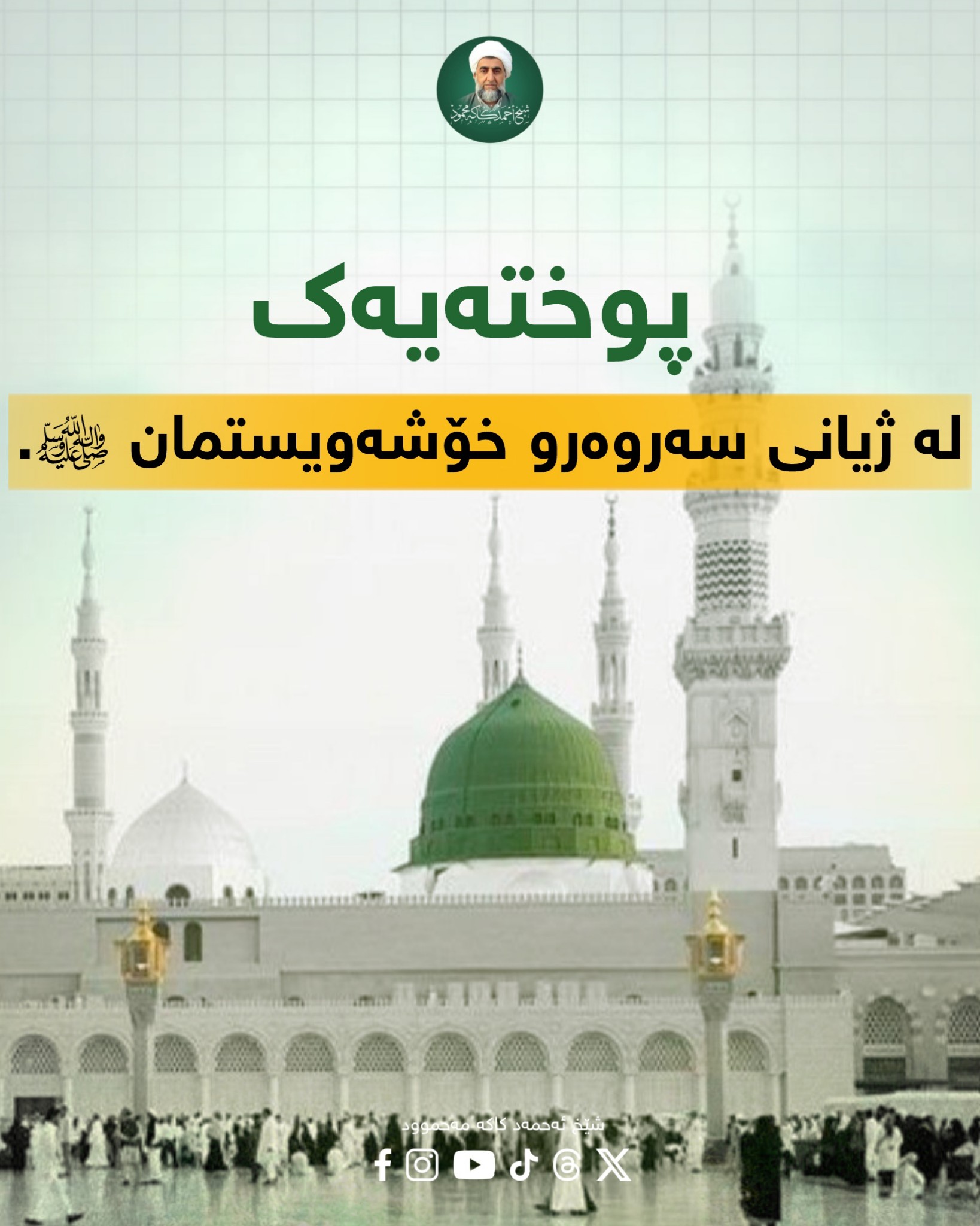 پوختەیەك لەژیاننامەی پێغەمبەری سەردارو سەروەرمان ﷺ.! پێغەمبەر (صلی الله علیه وسلم) ناوی (موحەمەدی كوڕی عەبدولڵای كوڕی عەبدولـموتەلیب) ە لە هۆزی (قوڕەیش) ە كە ناسراوە بە (ئەبولقاسم)، لە رۆژی دووشەممە لە مانگی (12) ی (رەبیعی یەكەمی) ساڵی (571) ی میلادی لە ساڵی (فیل) لە شاری (مەككە) لە ماڵی (ئەبو تاڵیب) لە دایك بوو. دایكی پێغەمبەر (صلی الله علیه وسلم) ناوی (ئامینە) ی كچی (وەهەب) ەو باوكی پێغەمبەر (موحەمەد) لەكاتی دەرچوونی بەمەبەستی بازرگانی بۆ شام كۆچی دوایی كردووەو لەشاری مەدینە نێژراوە كە ئەو كات موحەمەد (صلی الله علیه وسلم) لە سكی دایكی دابووە. پێغەمبەر لە تەمەنی (6) ساڵیدا بوو دایكی كۆچی دوایی كردووەو ئەركی بەخێوكردنی بە (عەبدولـموتەلیب) ی باپیری سپێردراوە. پێغەمبەر لە تەمەنی (8 ساڵیدا بوو كاتێك باپیری وەفاتی كردو چووە لای مامی (ئەبو تاڵیب)، پێغەمبەر (صلی الله علیه وسلم) لە تەمەنی (25) ساڵیدا یەكەمین ژنی هێناوە كە ناوی (خەدیجە) بوو. پێغەمبەر (صلی الله علیه وسلم) (3) كوڕی لە خەدیجە هەبوو بە ناوەكانی (قاسم و عەبدولڵا و ئیبراهیم)، بەڵام هەرسێكیان بەمنداڵی مردوون، هەروەها پێغەمبەر (صلی الله علیه وسلم) (4) كچی هەبوو بەناوەكانی (زەینب و روقیەو ئوم كەلسوم و فاتیمە). پێغەمبەر (صلی الله علیه وسلم) دوازدە مامی هەبووە، بەڵام تەنها (هەمزەو عەباس) موسڵمان بوون، هەروەها (6) پوری هەبووە كە لە خوشكی باوكی بوون، بەڵام تەنها (سەفیە) موسڵمان بوو، پێغەمبەر (صلی الله علیه وسلم) بە (سادقول ئەمین) بە راستگۆی و دەست پاكی ناسرابوو. لەتەمەنی (40) ساڵیدا لە شاری (مەككە ) لە ئەشكەوتی (حیرائـ) لە (17) ی رەمەزانی پیروز لە رۆژی دووشەمە خوای گەورە پەیامی بۆ ناردو بوو بەپێغەمبەر، سێ ساڵ بانگەوازی ئاینی ئیسلام بەنهێنی بوو دواتر خودای گەورە فەرمانیدا كە بانگەوازی بۆ ئاینی ئیسلام بە ئاشكرا بكرێت. ساڵی (10) پێغەمبەرایەتی ناونرا ساڵی ماتەمی (عامل حزن) بە هۆی مردنی (ئەبو تاڵیب) و (خەدیجە) ی خێزانی و هەر لەم ساڵەش چوو بۆ (تائیف) بۆ بڵاو كردنەوەی ئاینی ئیسلام. (1) ساڵ و (3) مانگ پێش كۆچكردنی بۆ (مەدینە) لە (27) مانگی (رەجەب) لە بەشێكی شەو لە شاری (مككە) وە چووە (المسجد الاقصی) لەوێ بەرز بۆوە بۆ ئاسمانەكان كە ئەم شەوە پێی دەگوترێ (الیل اسراء والمعراج) هەر لەم شەوەش لە ئاسماندا (نوێژ لەسەر موسڵمانان فەرز كرا). پێغەمبەر (صلی الله علیه وسلم) (13) ساڵ لەشاری (مەككە) مایەوە لەپاشان كۆچی كرد بۆ شاری مەدینە، لەساڵی (13 ی كۆچی لە (20) ی مانگی رەمەزان رۆژی هەینی فەتحی شاری مەككەی كرد. پێغەمبەر (صلی الله علیه وسلم) لە (27) غەزادا بەشداری كردووە، ماوەی پێغەمبەرایەتی كردنی موحەمەد (صلی الله علیه وسلم) (23) ساڵ بووەو لەساڵی (11) ی كۆچی لە (12) ی رەبیعی یەكەمی ڕۆژی دووشەممە لەتەمەنی (63) ساڵیدا لەشاری مەدینە پێغەمبەر كۆچی دوایی كردوو هەر لەمەدینە لەناو مزگەوتەكەی خۆی نێژراوە. یەكێك لەكارەكانی پێغەمبەر (صلی الله علیه وسلم) رزگاركردنی مرۆڤایەتی بوو لەبێ بڕوایی و كۆیلایەتی بەرەو بڕوا هێنان بەتاكو تەنیایی خواو بەندایەتی، هەندی لەڕەوشتە بەرزەكانی پێغەمبەر (صلی الله علیه وسلم) (راستگۆیی، دەست پاكی، دەم پاكی، دڵ پاكی، روخۆشی، ئازایەتی، تێكۆشەری، بەخشندەیی، میهرەبانی، ئارامی، لێبوردەیی، نەرموونیانی، بە بەڵێنی، بەوەفایی، خۆنەویستی). پڕۆژە بانگەوازییەکانی شێخ احمد کاکە محمود رحمه الله.