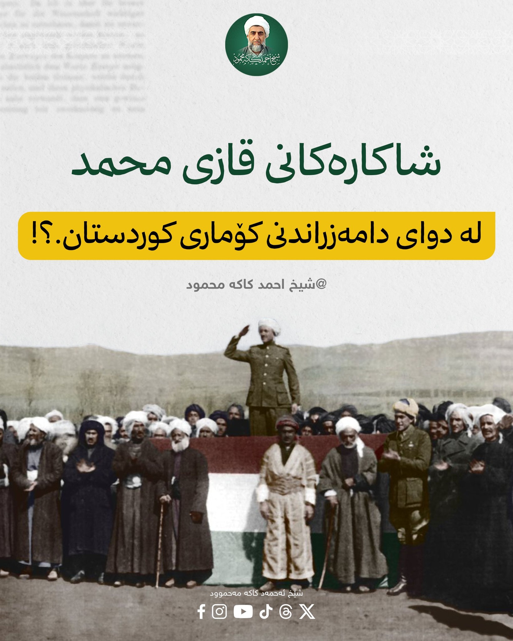 شاکارەکانی پێشەوا قازی محەمەد دوای دامەزراندنی کۆماری کوردستان.؟ دوای ئەوەی کۆماری کوردستان دامەزرا، قازی محەمەد چەندین هەنگاوی گرنگ و مێژوویی نا، لەوانە: ١- هەڵکردنی ئاڵای کوردستان: وەک یەکەم کار، ئاڵای کوردستانی لە دامودەزگاکان جێگیر کرد. ٢- بەفەرمیکردنی زمانی کوردی: بڕیاری دا زمانی فەرمیی سەرجەم فەرمانگەکان ببێت بە زمانی کوردی. ٣- نووسراوە فەرمییەکان: سەرجەم نووسراو و بەڵگەنامە و کارە کارگێڕییەکان بە زمانی کوردی ئەنجام دەدران. ٤- خوێندن بە زمانی دایک: سیستەمی پەروەردە و فێرکردنی لە قوتابخانەکان کرد بە کوردی. ٥- گەشەپێدانی ئابووری: برەوی بە کەرتەکانی بازرگانی و کشتوکاڵ دا بۆ بووژانەوەی ئابووریی وڵات. ٦- پەیوەندیی دیپلۆماسی: پەیوەندیی دیپلۆماسیی لەگەڵ یەکێتیی سۆڤیەت و وڵاتانی دیکە دروست کرد. ٧- ڕێکخستنی سەربازی: بڕیاری دا سوپا ڕێک بخاتەوە و مەشق و ڕاهێنانی سەربازییان پێ بکرێت بۆ ئامادەباشی و بەرگری. هەڵوێستێکی جوان و پڕ مانای پێشەوا یەکێک لەو ڕووداوە کاریگەرانەی ئەو سەردەمە، کاتێک بوو کە ناوەندێکی باڵای ئایینی ویستیان دیارییەک پێشکەش بە قازی بکەن. دیارییەکە بریتی بوو لە (قورئانێک و دوو بەرماڵ). قازی محەمەد قورئانەکەی وەرگرت و فەرمووی: "من قورئانەکەم قبووڵە، بەڵام دوو بەرماڵەکە پێشکەش بە گەلەکەم و حیزبەکەم دەکەم. واتە؛ با ئێوە لەسەر بەرماڵەکان دوعا بکەن، منیش بەم قورئانە حوکم دەکەم." ئەم هەڵوێستە جەخت لەوە دەکاتەوە کە قازی محەمەد هەرگیز لە ئایین، نیشتمان، نەتەوە، خاک و زمانی کوردی دانەبڕاوە و ڕێزێکی تایبەتی بۆ پیرۆزییەکان و دروشمەکانی وەک ئاڵای کوردستان و ئینتیمای نەتەوەیی هەبووە. بەراوردێک لەگەڵ حکومەتی هەرێم بکە لە ماوەی سی و چوار ساڵی حوکمڕانی بزانە قازی بە یازدە مانگ زیاتری نەکردووە؟ نووسینی: د.ئیدریس کاریتانی پڕۆژە بانگەوازییەکانی شێخ احمد کاکە محمود رحمه الله.