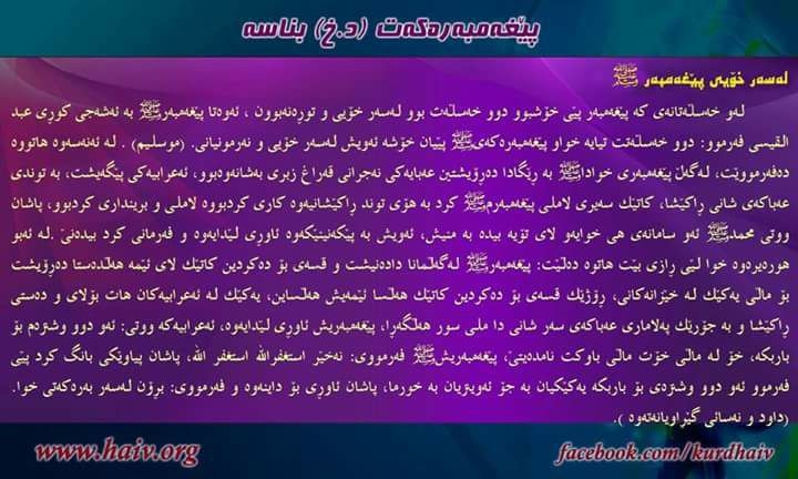 لە ئەبو هورەیرەوە خوا لێیی ڕازی بێت هاتووە دەڵێت: پێغەمبەر (دروودی خوای لەسەر بیت) لەگەڵمان دادەنیشت و قسەی بۆ دەكردین، كاتێك لاى ئێمە هەڵسدەسا دەڕۆیشت بۆ ماڵی یەکێ لەخێزانەکانى.. ڕۆژێک قسەى بۆ دەکردین کاتێک هەڵسا ئێمەش هەڵساین، یەكێك لە ئەعرابیەكان هات بۆ لای و دەستی ڕاكێشا و بە جۆرێك پەلاماری عەباكەی سەر شانی دا ملی سوور هەڵگەڕا، پێغەمبەریش (دروودی خوای لەسەر بیت) ئاوڕی لێ دایەوە، ئەعرابیەكە وتی: ئەو دوو وشترەم بۆ باربكە، خۆ لە ماڵی خۆت و ماڵی باوكت نامدەیتێ، پێغەمبەریش (دروودی خوای لەسەر بیت) فەرمووی: نەخێر أستغفر الله أستغفر الله، پاشان پیاوێكی بانگ كرد، پێی فەرموو: ئەو دوو وشترەی بۆ بار بكە، یەكێكیان بە جۆ و ئەویتریان بە خورما، پاشان ئاوڕی بۆ داینەوە و فەرمووی: بڕۆن لەسەر بەرەكەتی خوا.
